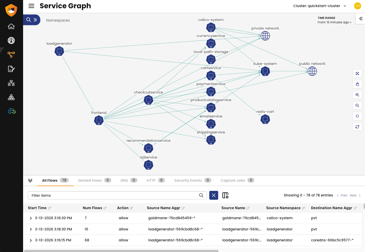 In the Calico Cloud web console, go to Service Graph. Within a minute or two you'll see every service and namespace mapped as a live node, with directional traffic flows between them.